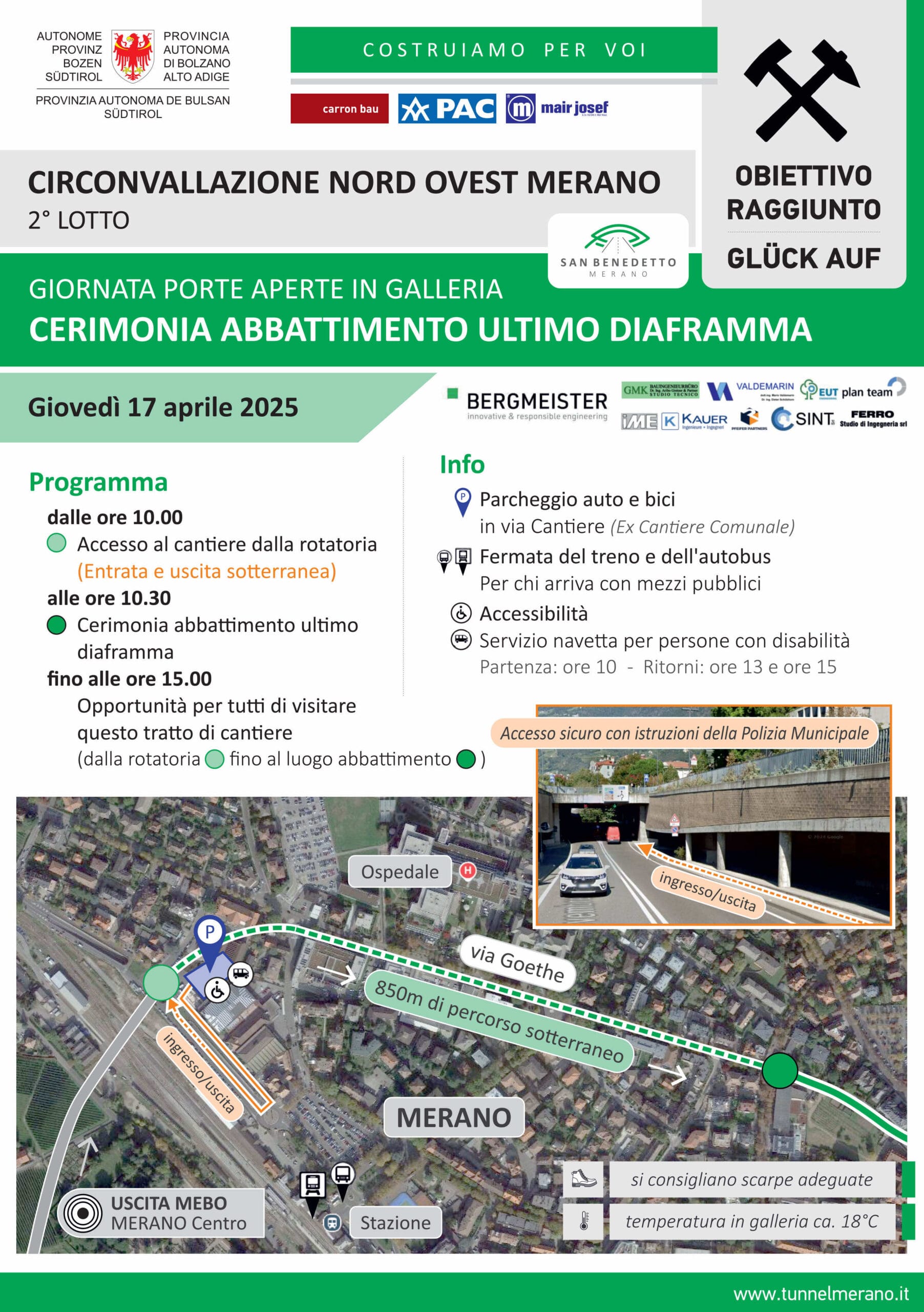La giornata inizierà alle ore 10.00 con l’accesso al cantiere dalla rotatoria, tramite ingresso sotterraneo. Alle ore 10.30 si terrà la cerimonia ufficiale di abbattimento dell’ultimo diaframma.